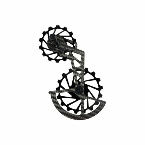 - Dit product bestaat uit een carbonkooi en twee 7075 aluminium pully’s (14 & 17 tanden) met volledig keramische verzegelde lagers.